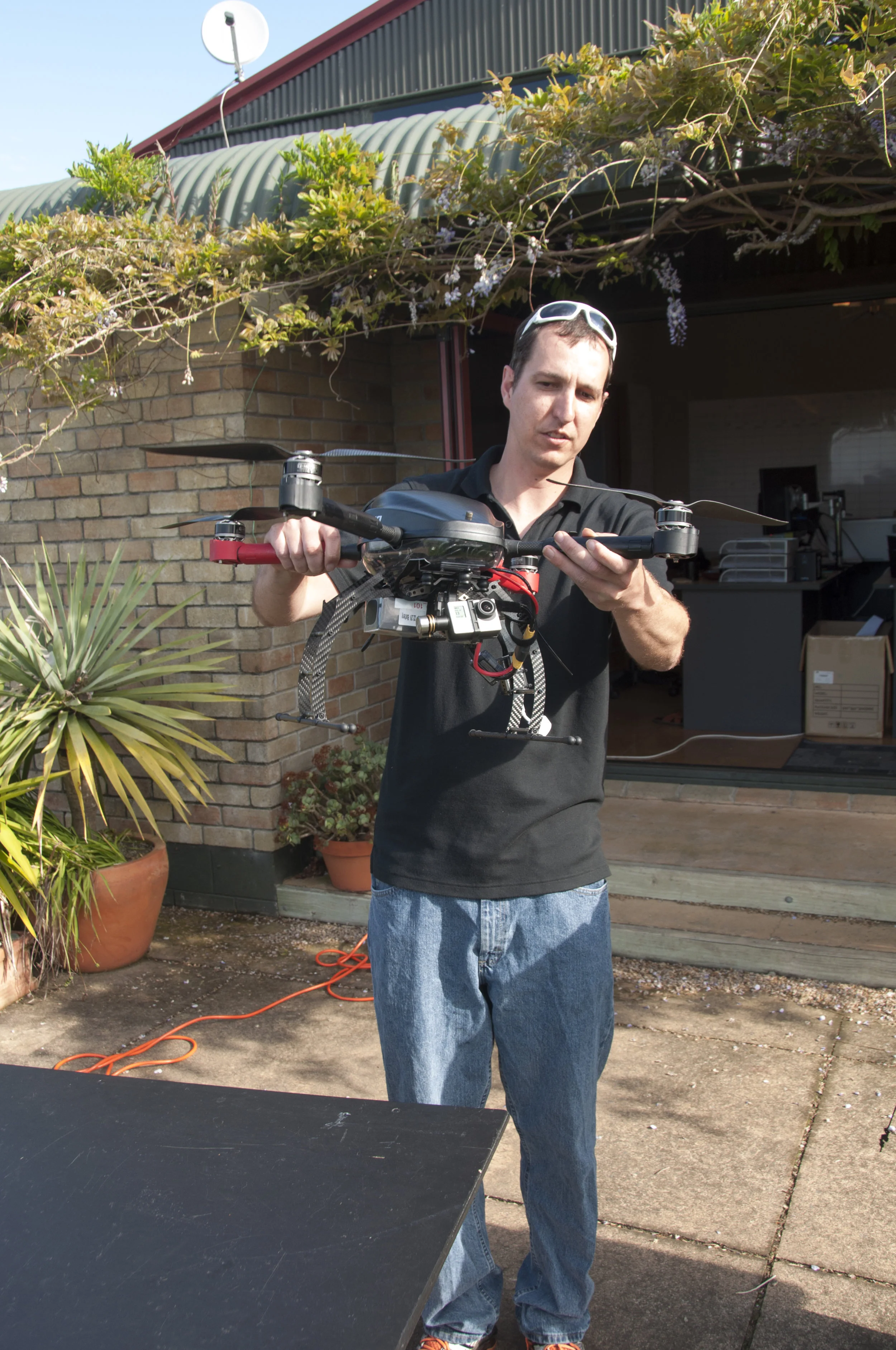 “The rotors have one fixed direction but half go clockwise and half anticlockwise— if all were spinning one way you would get yawing. The onboard controller program in level mode, and with active GPS, counteracts the wind to maintain position. Without the GPS, if the craft drifted the altimeter would still hold it at constant height. You can alter variables while flying. You can put it into manual mode where it would not be automatically stabilised—like flying a helicopter.”