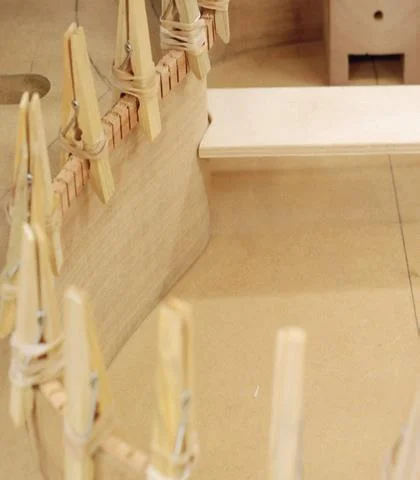 Also at this stage the linings will still be slightly high, as will the tail and heel blocks. Use a block plane to trim the top surface of the linings and the blocks to suit the dome of the back and to enable it to sit tight down on the sides. The strut ends or notches may also need tweaking to get the right fit. When the fit is good and the dome of the back is maintained it is ready to glue on. Apply glue to to the surface of the lining, and to the top surface of the heel and tailblock. The back is lowered into place and clamped at the heel and tailblock first (using large 6 mm thick clamping cauls to spread the pressure over the block). Check centrelines, and then clamp around the body, using 30 mm square clamping cauls of thin ply - it is important to position the cauls and clamps so that the clamping pressure comes down onto the lining and the side, rather than too far inboard which will depress the back, or too far outboard which will induce too much arch. Do not overtighten the clamps, they are squeezing down onto the edge of a piece of wood which is only 2 mm thick.