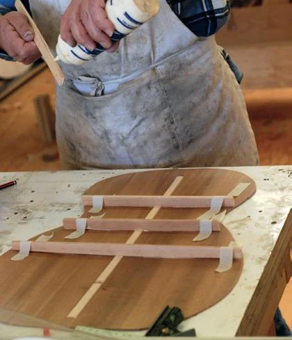 Normally the back and top are made from bookmatched pieces of wood, so that the grain pattern runs symmetrically about the centreline. The two halves are edge-glued before bringing the pieces down to their final thickness (for the back approximately 2.5 mm, and for the top somewhere between 2.5 and 3.0 mm). Before edge-gluing, the centre joint is 'shot' with a long plane to give a smooth and true edge that can be glued to give an invisible join. For gluing, pressure has to be applied inwards and this can be done using wedges that are tapped in against a rail at either side or by using small nails that are placed just to the outside of the back or top to be joined, and after placing weights either side of the centre join to prevent lifting as pressure is applied, tapping them inwards to push the two halves together closely. Remember to place greaseproof paper or something similar under the centre join to prevent gluing it to the baseboard.