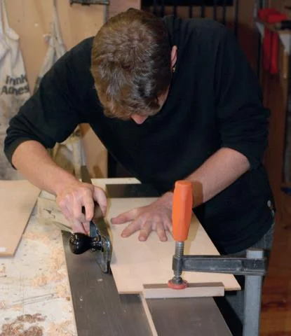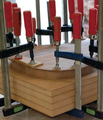 Once dry, the clamps are removed and the overhang of the top and back are removed using a spokeshave or block plane. It is also possible to use a router with a flush cutting bit.