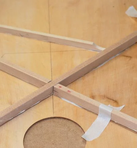 3: Soundboard braces dimensioned to template 4: Glue on main X braces dimensioned to template 5: Glue on main X brace and harmonic bar prior to vacuum bagging