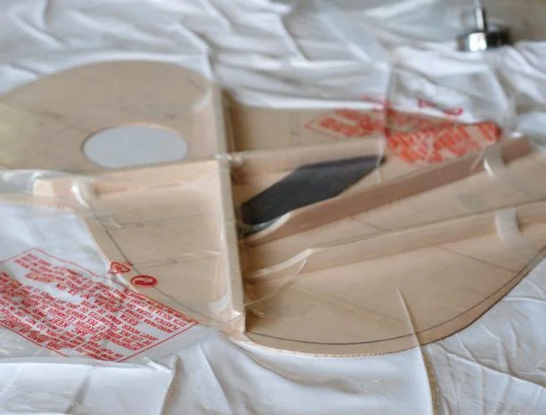 At the CFW we use a vacuum bagging system for gluing on most of the reinforcing and bracing of the back and the soundboard. It allows strong and even clamping pressure without distorting the thin wood. To glue on the strip apply glue to one side of the reinforcing strip and use masking tape to position it centrally over the glue join of the back, insert in the vacuum bag and turn on the vacuum pump, check that nothing has moved and leave to dry. Glue squeeze-out is cleaned up and the centre strip is planed down to approx 3 mm height and shaped so that the top is rounded crossways (using a chisel, small plane and sandpaper).