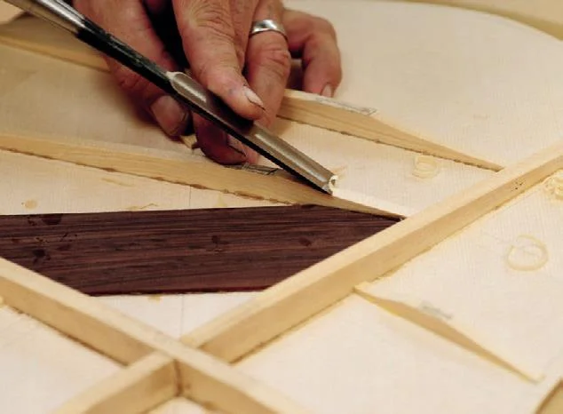 After joining, the outside face of the soundboard is smoothed using the thickness sander, taking care to remove only the minimum of material. Draw on the outline of the guitar using the template, and aligning on the centreline. Measure from the template where the centre of the soundhole will be and mark this on the top. A circle cutter with a small spike in the underside will allow accurate cutting of both the inside and outside diameter of the rosette channel to a depth of 1-1.5 mm. The channel width is cut so that the material used for the rosette, for example a strip of herringbone-pattern purfling, is a snug fit otherwise glue lines will show around the edge of the rosette. The waste between the cuts is chiselled out using a narrow chisel and a small router plane. The herringbone strip can be bent to suit using the side-bending iron. Once a good fit has been achieved, glue is applied to the channel and the rosette pushed down into this. The top surface of the rosette should be slightly proud of the soundboard, and once the glue has dried it is scraped/sanded flush with the soundboard. The soundboard is trimmed on the bandsaw to 5 mm outside the outline of the guitar then it is thicknessed from the reverse side to the rosette. Top thicknessing is critical to the finished sound of the instrument, and will vary depending on wood used, and how stiff that particular piece of wood is. Sitka spruce is normally thicknessed down to somewhere between 2.6 and 3.0 mm. Once thicknessed, the soundhole can be cut out from the rosette side using a circle cutter. Leave a margin of about 5 mm between the inner edge of the rosette and the soundhole. The soundboard is now too thin to take the tension of the strings without collapsing, so has to be selectively reinforced with braces. The way these are glued on and shaped will influence not only the structural stability of the guitar soundboard but also the sound.