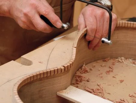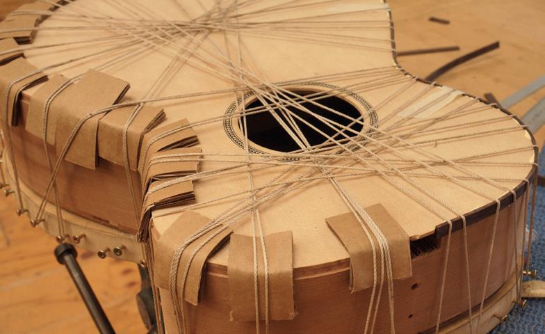 When the glue is dry, remove clamps and ease the body out of the mould. Glue kerfed linings onto the soundboard edge of the sides and once dry, plane these smooth and flush to the top, with a slight bevel upwards to accommodate a slight dome in the soundboard.
