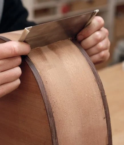 Use a cabinet scraper/sandpaper to clean up glue squeeze-out and to scrape the binding height down to the guitar body. The bindings will also need scraping around the sides to tidy up the join with the body. Take care not to remove too much thickness in the bindings when doing this. Finish-sand the body with 180/320/400 grit abrasive paper.