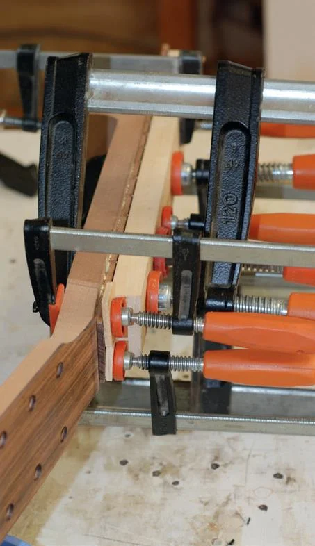 The heel block is glued onto the sides such that the end grain of the heel block is the glue surface. This is not a particularly strong way of joining wood, but there are also two bolts running through it into the neck and the top and bottom surfaces are also glued so there is plenty of strength. Prior to gluing, the glue surface of the heel block is planed to give it a curve to match the outline shape of the guitar. Dry-clamp the heel block into position and check that the centreline of the block matches up with the centreline of the baseboard, the block sits down flat on the baseboard, and the curve planed into the glue surface is accurate and a good fit to the sides/mould. If all is OK, remove clamps, apply glue (Titebond or similar) and clamp back in position. Clean up excess glue with a damp cloth.