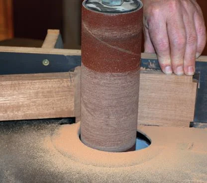 The head is thicknessed to suit the tuners being used. Generally this will fall in the range of 12-14 mm thick so that the threads on the tuner posts will engage from both sides. Remove material from the back of the head using a vertical fence set up on a bobbin sander. This also cleans up the back of the scarf joint on the neck.