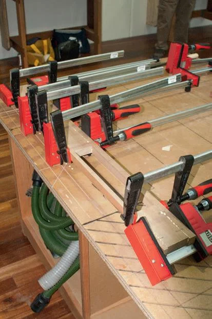 The clamps used in this case are the Australian-made Frontline panel clamps, which can apply significant pressure to bring the boards together, but they also apply a proportion of that pressure vertically, ensuring the boards remain at across during clamping.
