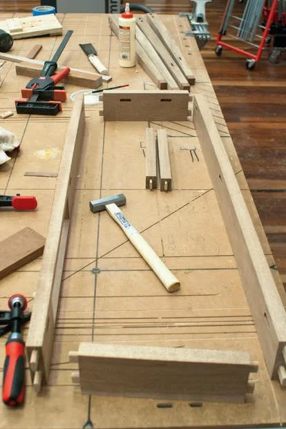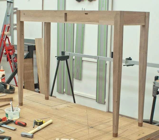 1: Clamping the front skirt together 2: The front skirt with the drawer cavity 3: The skirts and legs with mortices cut and floating tenons inserted, ready for assembly. 4: Dry fit of the frame