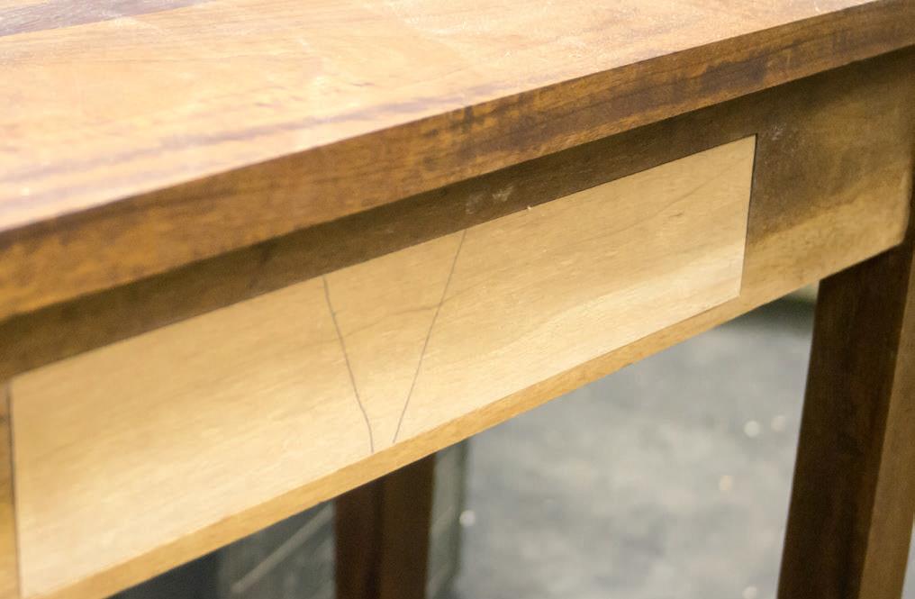 As a glue, it is very strong indeed, is waterproof (so perfect for outdoor applications) and, surprise surprise, is great at filling gaps. Once the glue was set, the clamps were removed and the excess glue scraped off. The skirt was made oversized, so the ends could be docked, leaving a front with a neat, square hole. You can cut the hole in other ways, but in this case I wanted to preserve the piece that was being removed for the drawer front. This way, when the drawer is closed, the grain and colouring will be continuous across the table front.