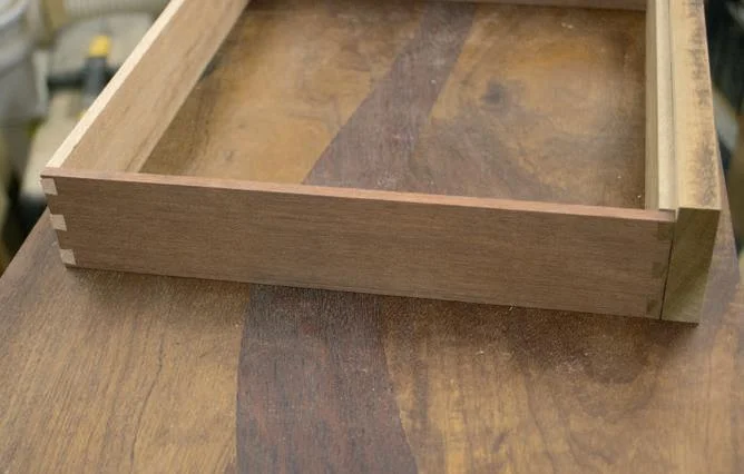 The drawer is a simple affair—a couple of rails inside the carcass of the table for the drawer to rest on and the drawer itself is a simple dovetail box with a base. Using the Gifkins dovetail jig made for short work of the drawer and the piece originally cut out of the front of the skirt is then attached to the front of the drawer, so it blends in.