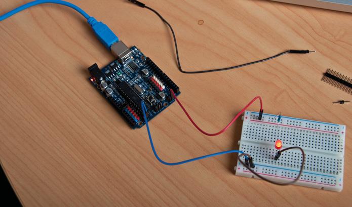 Time to power up. Plug the USB cable from your computer into the YourDuino. The PWR LED should come on and the pin 13 LED should be blinking in the way you last programmed it. If necessary load the original Blink and upload it to YourDuino. The LED you just wired up on your breadboard should blink the same as the 13 LED on YourDuino. If not, recheck that you have it wired as in the photos and the LED's longer lead is to the left. To work out what is happening, unplug the wire from YourDuino pin 13 (keep the pin with it).