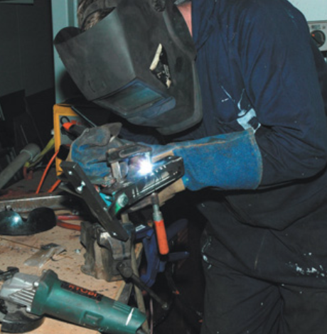 The front arm that takes the front contact wheel is 40x40x4mm RHS. Grind back the corners of the RHS and it will slide into the frame with no slop. If the weld bead in- side the 50 mm RHS is too large, either flatten it with a die grinder or use some careful taps on the face of the 40mm RHS to form a hollow so it will slide into place.