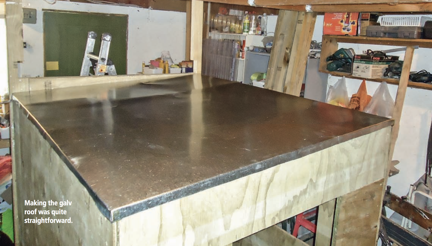 Making the galv roof was quite straightforward. I cut the sheet at 1450 mm long using a guillotine and did all the folding in situ using a hammer and a piece of angle iron clamped to the sheet to form the fold edge. I marked the roof opening on the underside of the galv and carefully removed it and laid it upside down on my worktable. I then cut out a 450 x 450 mm square, leaving a 25 mm edge overlapping the opening. Then I turned the galv over, carefully replaced it on the ply roof, and folded up the edges using the length of angle iron, clamped in position so the galv edge matched the opening in the ply. For the corners I made angle brackets that fitted over the turned up edges and secured these in place with silicone sealant. This provided a dam around the opening so no water from the roof can get into the cubby.