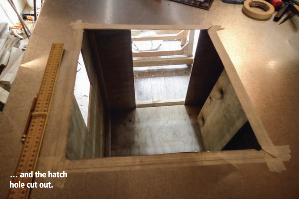 The roof consists of two cut panels 700 x 1170 mm, with the joined edges aligned with the plastic strip. I cut an opening for the hatch 500 x 500 mm in the finished panel, located to suit a hatch cover which would be tted to the deck frame above. The climbing wall is a single piece of ply, but had to be cut in two for transportation. This cut was located so a backing piece of 90 x 45 mm set between the two verticals would provide edge support for the ply.