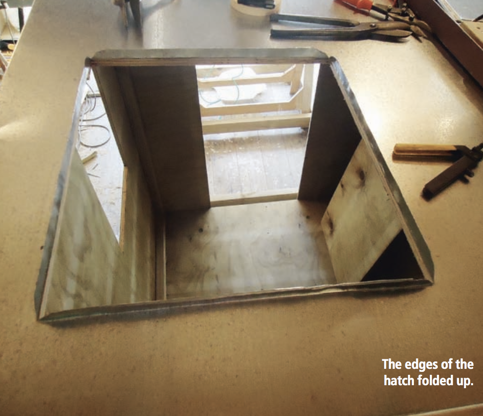 The hatch cover was the most problematic part of the project. It consists of two lengths of 90 x 45 mm cut so the top edge is flush with the top of the deck frame and the bottom edge is 10 mm clear of the hatch below. These were glued and screwed to five lengths of decking above and a piece of 7 mm plywood set into angled grooves on their inside faces. This rigid assembly is hinged to a length of decking screwed to the top deck side beam. The ends of the decking strips are rounded and sit on the cross members. To provide full weather proofing, a piece of corrugated polycarbonate was secured between the decking timbers and the plywood piece during assembly.