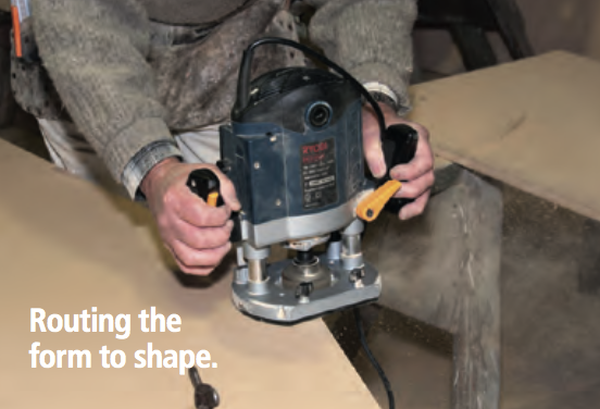 There are specially marked cuts that don’t traverse the board completely, leaving a solid gap at either end of the cut. These cuts are made as a plunge cut. This is an element of the design that arose from experience. Once the kerfed section is bent, it is covered with another thinner piece of MDF that is bent to the same curve and screwed and glued in place. The blank sections allow the screws to hold; previously the gaps were too small to allow them to hold properly.