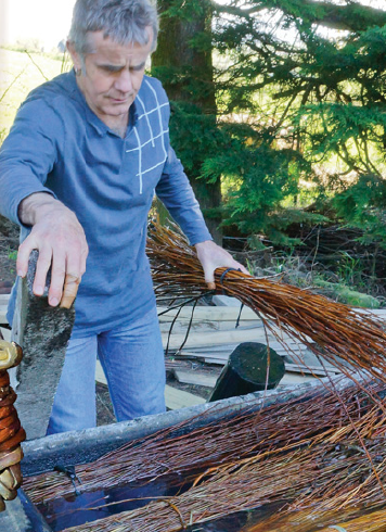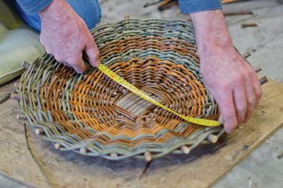He continues the weave until the tips are reached then trims off protruding bits with secateurs. To tighten the weaving, he taps the willow down with a rapping iron. When the wale is fi finished, Mike uses a ruler to check for uniform height all around. Then he puts down uprights in a “4 behind 2” border. Mike Lilian explains that a wale is the name given to a type of stroke in willow weaving that involves working three or more rods at the same time and in a defi ned sequence.