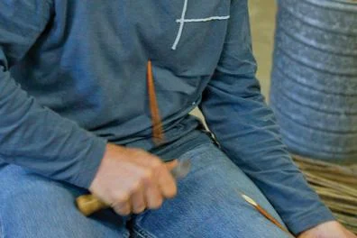 The photos show Mike Lilian working very forcefully—it is tough to be a weaver, pushing and pulling thick, stringy willow rods.
