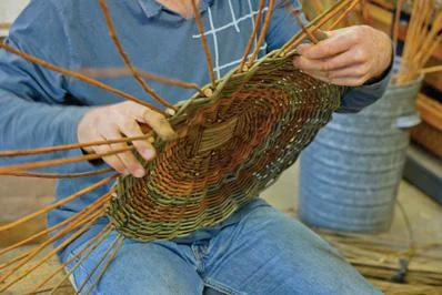 As the weaving progresses, Mike pulls the rods up to form a growing saucer shape, trimming off protruding ends with secateurs and finally cutting off the protruding sticks after the 460 mm size is achieved.