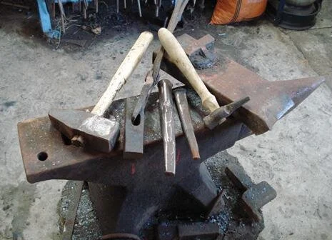 You will need: a forge, tongs, punch, sledgehammer, drift, small hammer and an assistant. A drift is a piece of metal the size and shape of a replacement hammer handle and tapered to fit the punched hole.