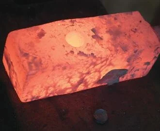 For larger hammer heads, then place a fi re brick or kiln shelf either side of the forge fire, so the gap in the middle is less than the length of the hammer head. Place the head across the gap so the ends are protected by the fire brick The blast from the forge will heat the centre and the ends are protected by the fire brick.