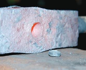 For this, we need a drift (or two). They are tapered so the small end fi ts into the punched hole, and in this case, the cross-section expands to larger than the final size of the hole. Heat the head up in the forge so it is a bright-yellow colour, place the drift into the hole and drive it part-way through.