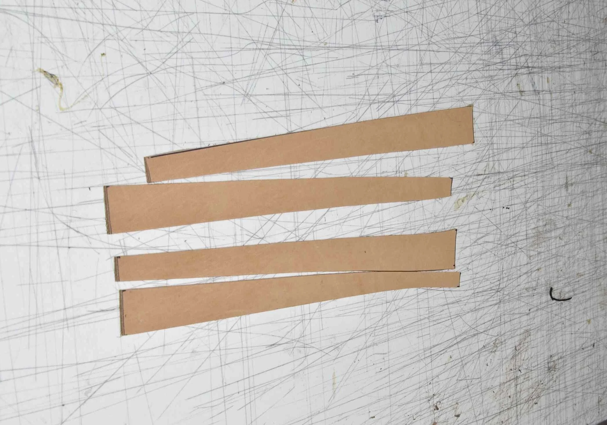 We are now ready to assemble jandals. First 25 mm at each end of the four straps must be scuffed with coarse sandpaper on the flesh side of the leather. If this is not done, dye and sealer will prevent the glue from being absorbed and it will be ineffective.