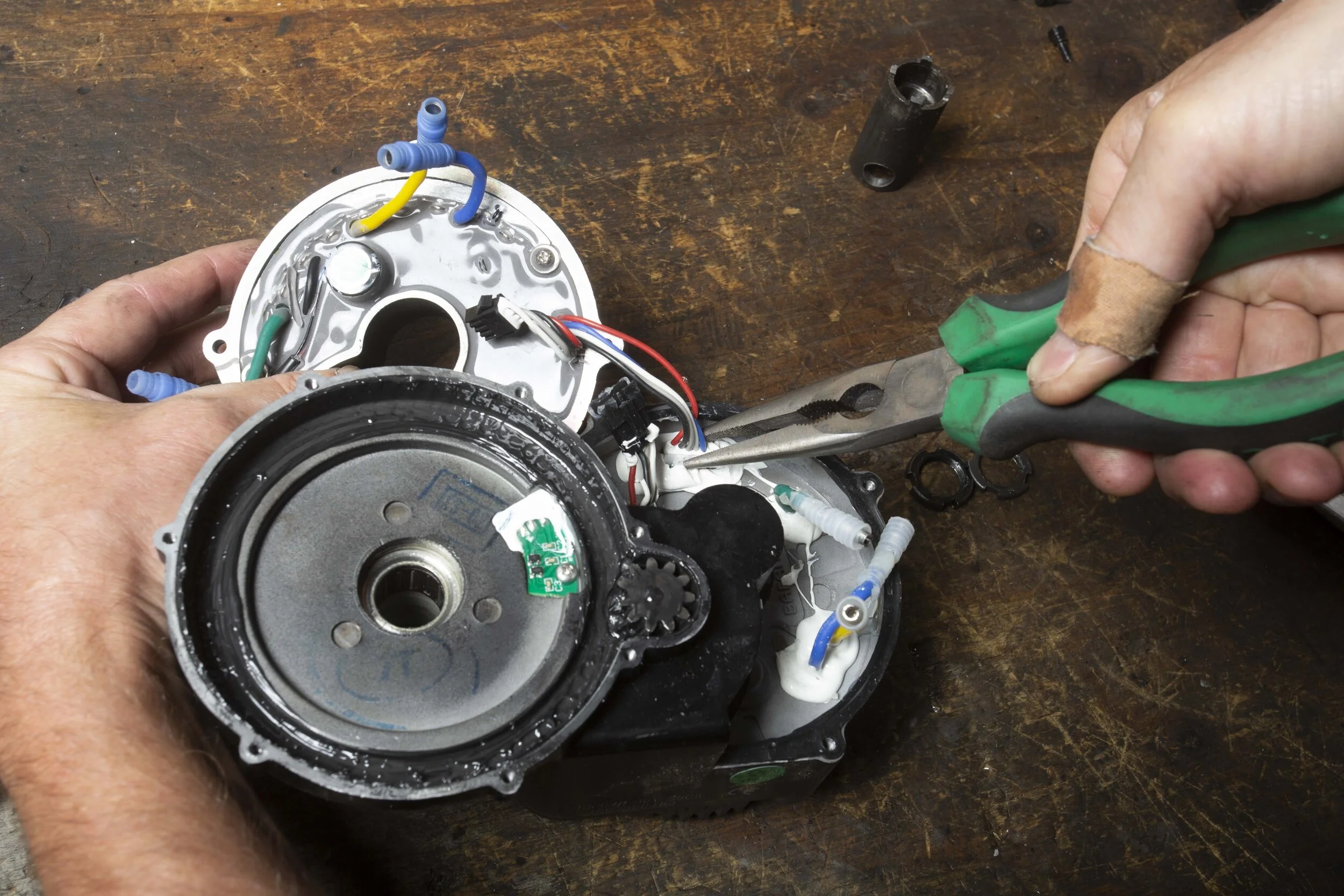On the back of the large gear, there is a magnetic plate that tells the controller when you are pedaling so it can provide power. Sometimes these plates can crack and create an intermittent on/off power supply which won’t show up as a fault code on the Speedo. There is also a one-way clutch inside the back of the gear. These don’t give much trouble and the chances are that if water has got into this as well then it’s probably better looking at a new motor.