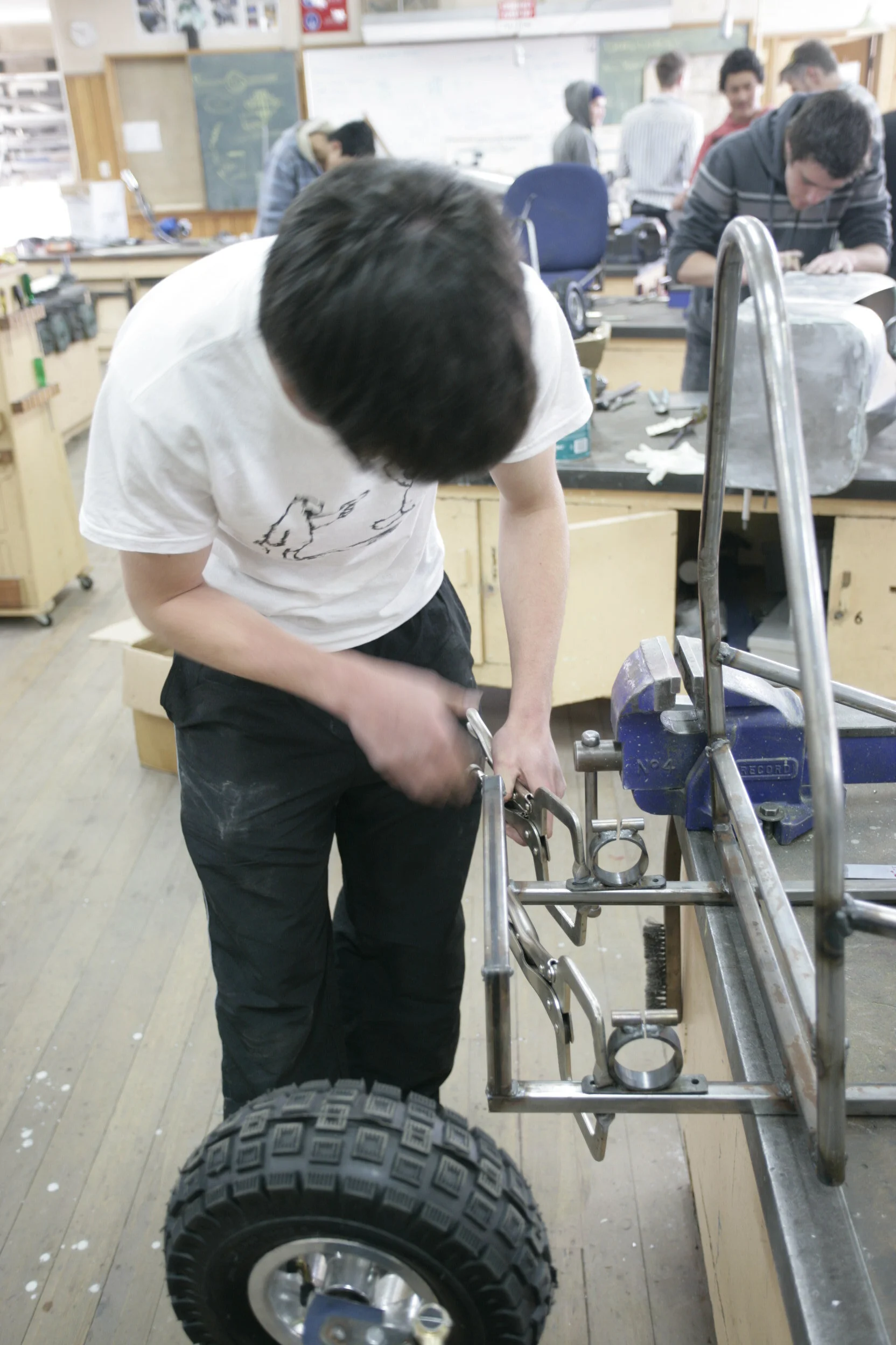 The idea came about because my Year 11 students just were not interested in the mini-bikes being made at Year 12-13 in 2009. In the past, I had successfully built electric mini-karts powered by car starter motors, and these perform well. But the price of automotive batteries has now become prohibitive and the cheap boat roller wheels just don’t last with the wheel-spinning and drifting that electric karts are capable of.