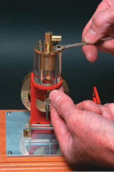 Now the displacer assembly needed to be fitted to the bracket with the bore in the centre of the piston-sleeve. To do this, I had to make a dummy piston the right size for the bore that screwed onto the 3 mm piston rod. This located the displacer assembly while I spotted the bolt holes. The holes were drilled and threaded M5, completing the dis-placer cylinder.