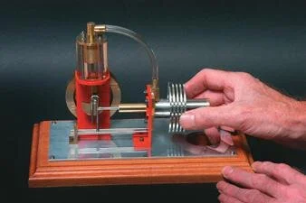 The Stirling engine is a fascinating engine that magically converts an external heat source into rotary motion.