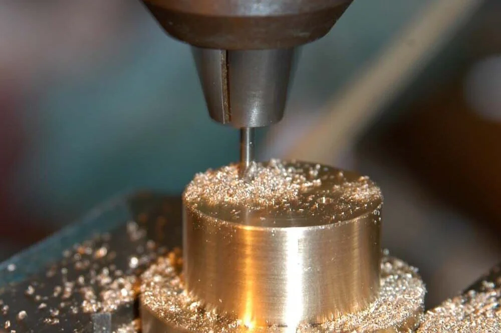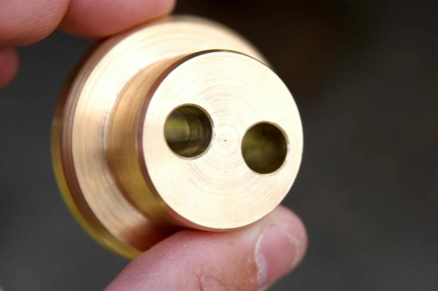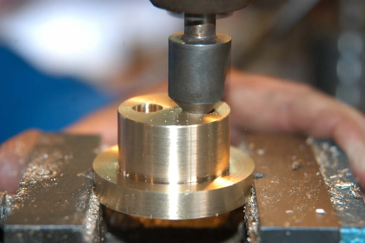 Mount a 4-jaw chuck and load the 50.8mm brass rod into it. Don a safety helmet and with a very sharp roughing cutting tool, face off the rod. Next turn the body to size (35mm diameter to an 18mm depth, with an 8mm base deep base at the 50.8mm diameter). Take care to ensure that the depth of the brass body for each turned diameter is within 1mm of the correct measurement. This is to ensure that the lengths of the centre punch and the optical rod will have the correct depth when inserted into the body. Change the cutting tool to a round-nosed tool and take a skim over the turned surfaces to give a smooth finish.
