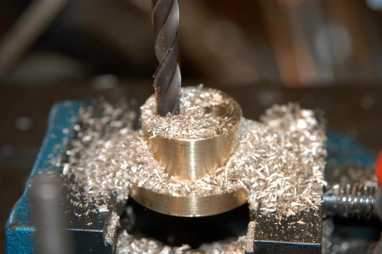 Mount the body in a drill vice and drill pilot holes of, say, 2.5mm for the two holes right through. As the diameter of these holes needs to be accurate, I used step-drilling, starting with a drill of 9.3mm diameter, then a 9.4mm diameter, then a 9.5mm diameter. I clamped the body in the drill vice, which was clamped to the drilling machine table. This way, I could change drills without shifting the drill vice. Ensure that the drill feed is very slow so that ridges are not built up in the inside of the holes.
