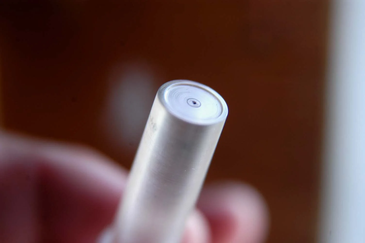 I made the body from 50.8mm (2”) diameter brass but it could be aluminium (steel can rust without treatment). The centre punch is made from a 10mm diameter rod of common tool steel called “silver steel” and the optical viewing rod is from a 12.5mm (1/2”) diameter bubble-free clear acrylic rod. Because this American rod is in imperial measurement, the metric size when it’s bought may vary down to about 12.1mm. The measurement is given as 12mm in this project for safety sake, but the top part of the viewing rod is essentially to be left as purchased.