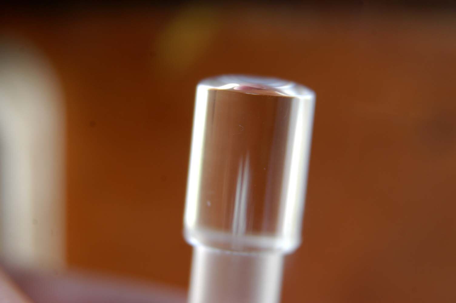 Part the viewing rod off or take it out of the lathe and cut to length, i.e. 46mm. Put the viewing rod back in the lathe with the largest diameter facing the tailstock. Using a clean, smooth file and low lathe speed, carefully shape a curve on the face so that the centre is approximately 1.2mm above the outer edge. Polish this face using 400-grit Wet and Dry sandpaper and polish with Brasso as above.
